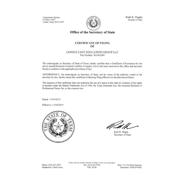 Constituidos conforme a la legislación del Estado de Texas para ofrecer certificaciones y servicios educativos.